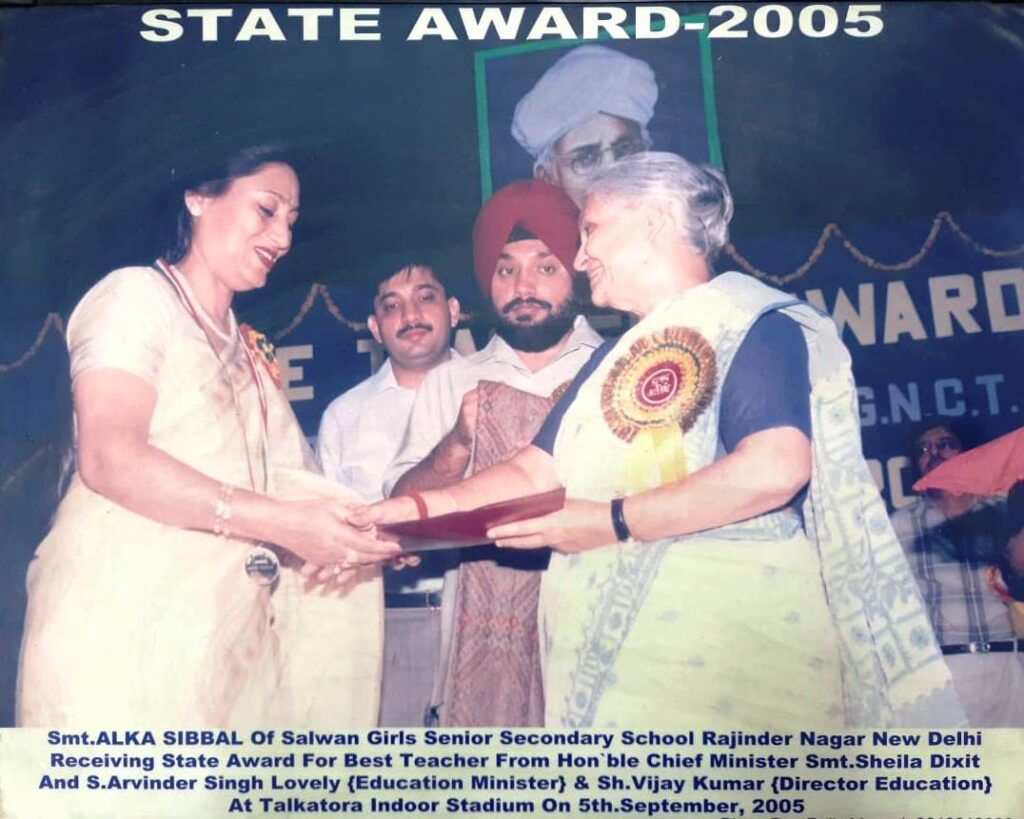 Mrs. Alka Sibbal, PGT (Home Science) awarded by the then Chief Minister of Delhi Mrs. Sheila Dikshit in the year 2005.