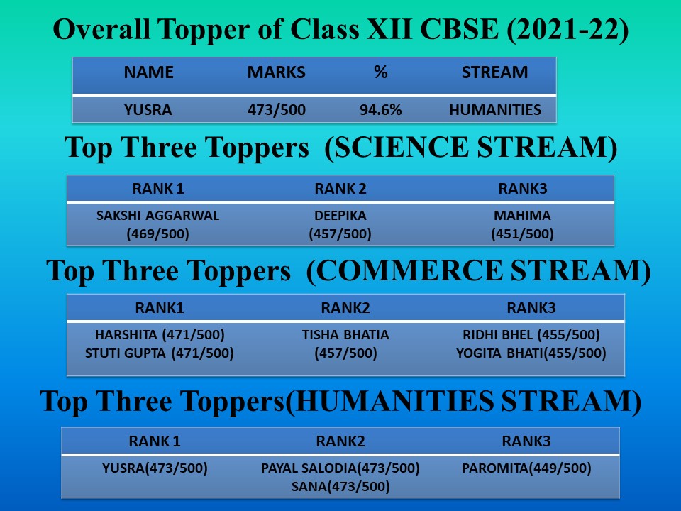 Congratulations to all the students of class XII for their stupendous performance in CBSE Board results 2021-22.All the best wishes!