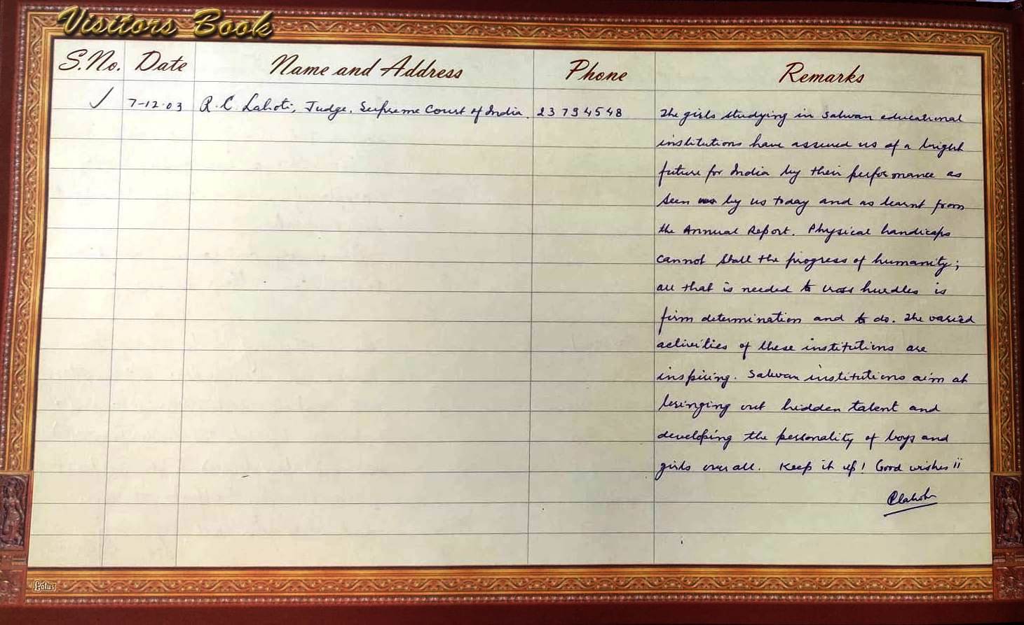 | Justice R. C. Lahoti : Chief Guest for Annual Day celebration on 07.12.2003 | Supreme Court of India | Click Here |